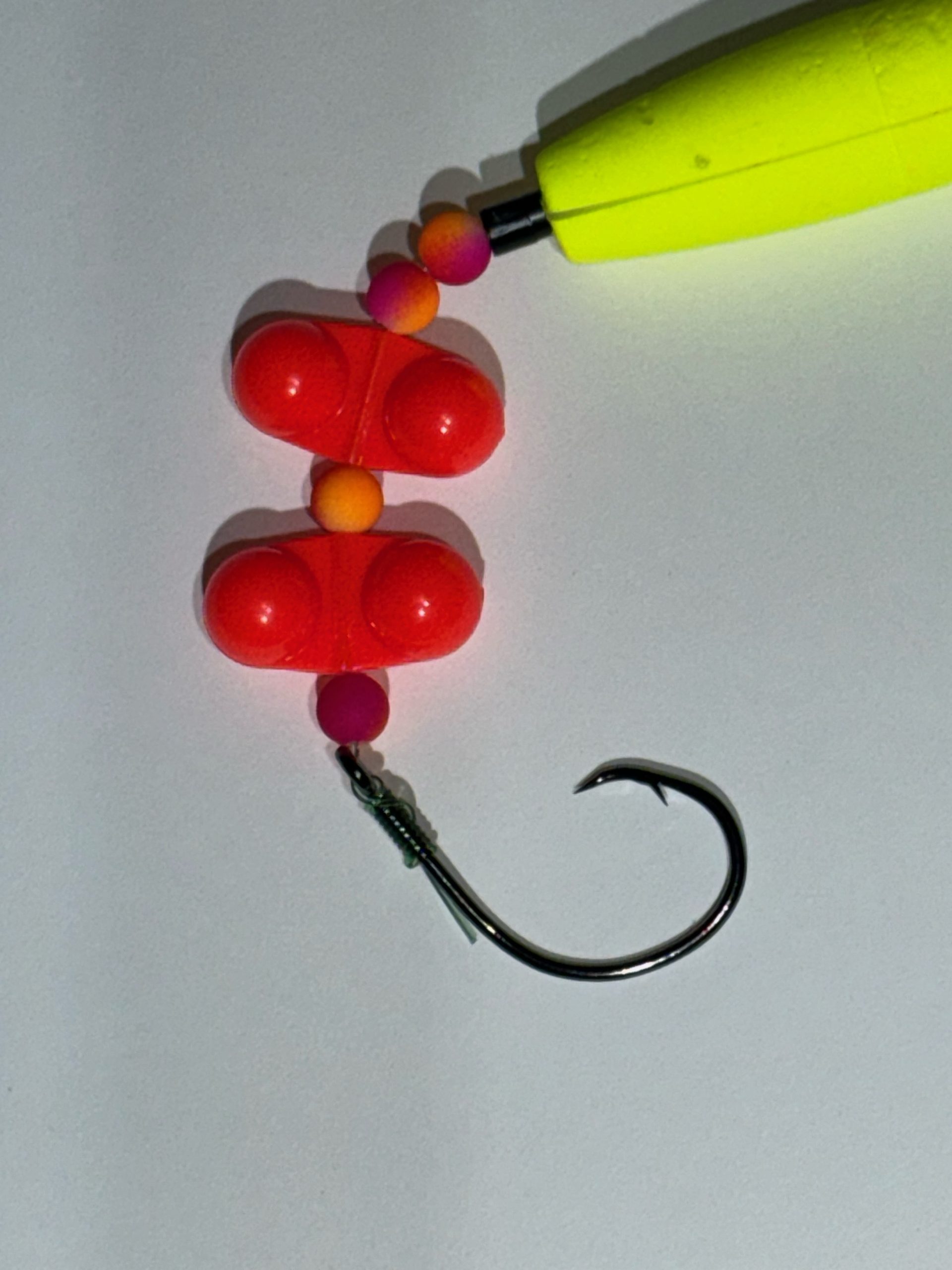 6/0 Hook with an 18″ 60Lb monofilament line. The rig comes with 4 fluorescent beads, 2 rattles, and a 3″ peg float. Colors may vary depending on inventory.