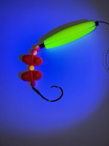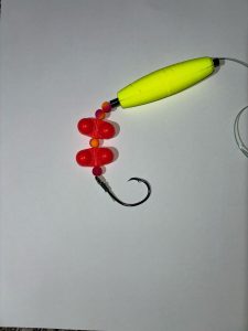 6/0 Hook with an 18″ 60Lb monofilament line. The rig comes with 4 fluorescent beads, 2 rattles, and a 3″ peg float. Colors may vary depending on inventory.
