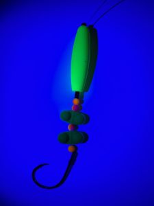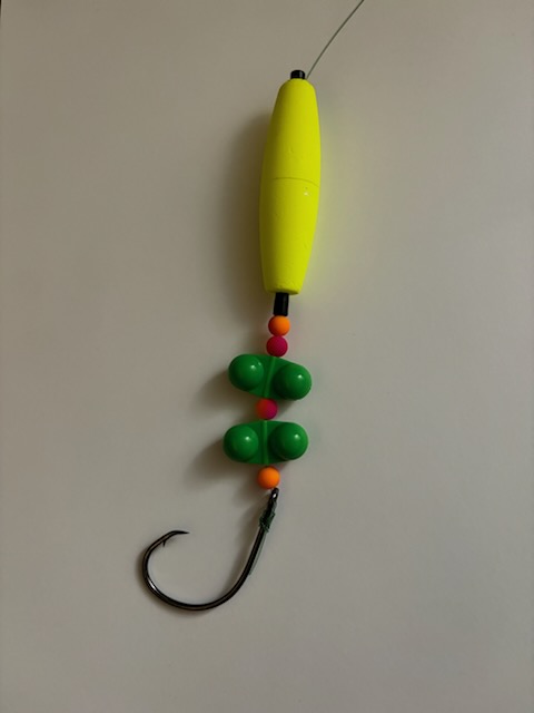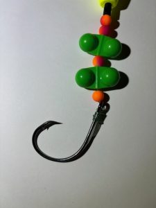 8/0 Hook with an 18″ 60Lb monofilament line. The rig comes with 4 fluorescent beads, 2 rattles, and a 3″ peg float. Colors may vary depending on inventory.